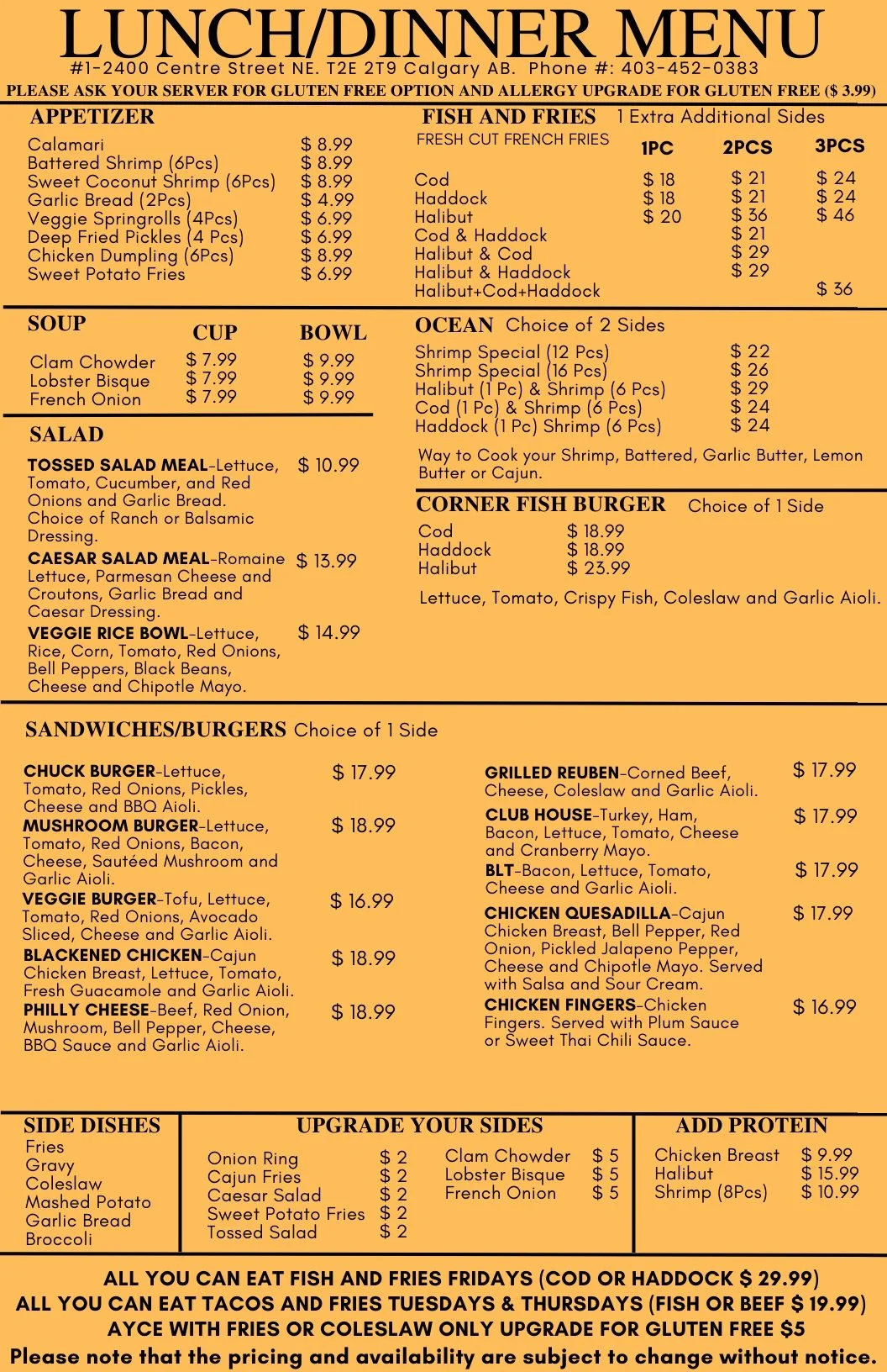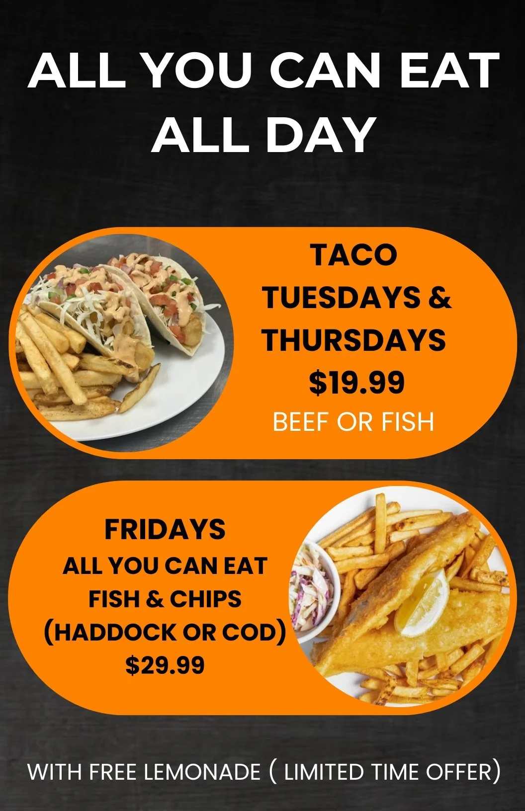 ALL YOU CAN EAT FISH & CHIPS FRIDAYS (Haddock and Cod) ($29.99) 〰️ 15% SENIOR DISCOUNT WEDNESDAYS (DINE IN ONLY) 〰️ ALL YOU CAN EAT TACOS & FRIES TUESDAYS & THURSDAYS ($19.99) 〰️ 20% DISCOUNT TO ALL OUR FIRST RESPONDERS DAILY 〰️ UNLIMITED LEMONADE $4.50 〰️ ORDER 1 FULL MEAL 1 KIDS EAT FREE (5 YEARS OLD AND UNDER) (6-12 YEARS OLD 50% OFF) MONDAYS 〰️